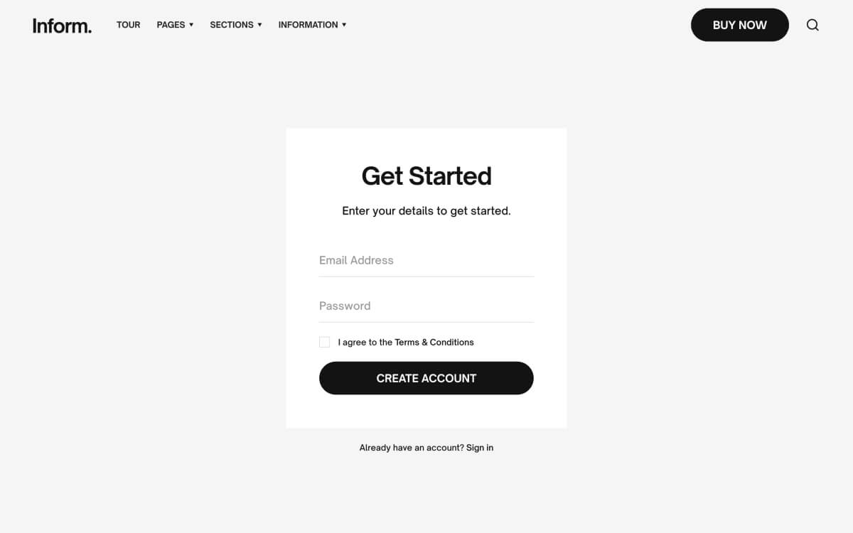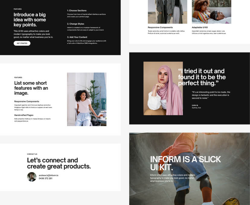 Create beautiful pages with ease using Inform’s expertly styled collection of pages, sections and UI components.