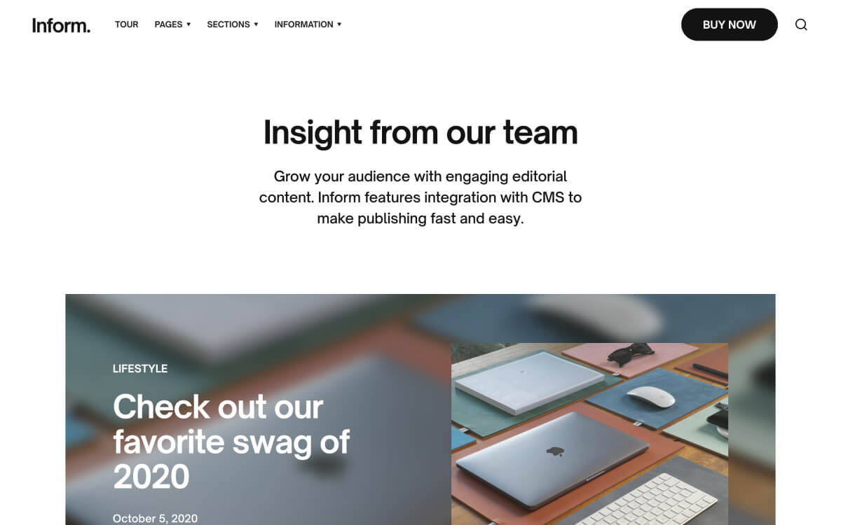 Express yourself through Inform’s bold typeface and no-fuss aesthetic. Everything you need is on-hand with 70 page sections across 26 layouts.